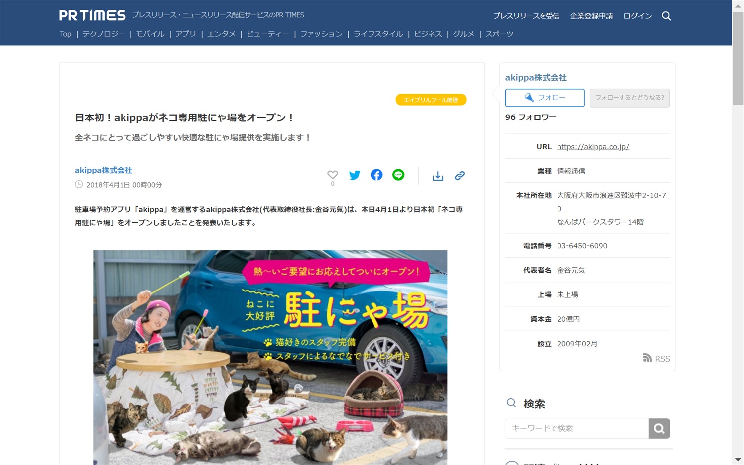 akippa株式会社のプレスリリース(2018年4月1日 00時00分)日本初!akippaがネコ専用駐にゃ場をオープン!